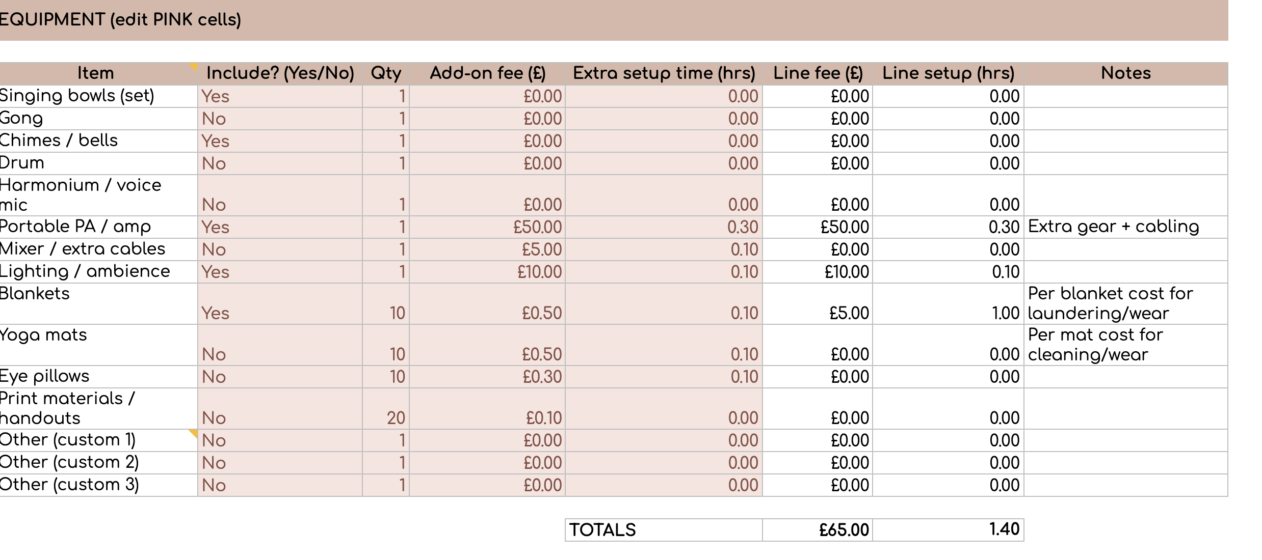 This pricing spreadsheet acts as a guide and understands the reality of sound healing work, including: